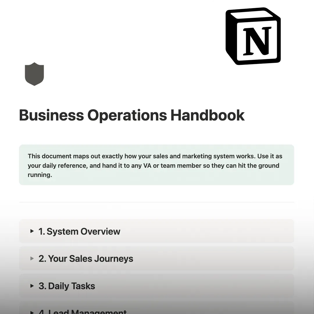 You get a branded Notion handbook that documents your setup in plain English. Your booking links. Your key messages. Your process from first enquiry to booked call and beyond. Plus daily actions and a VA handoff checklist, so you can run it confidently now and delegate it cleanly later.